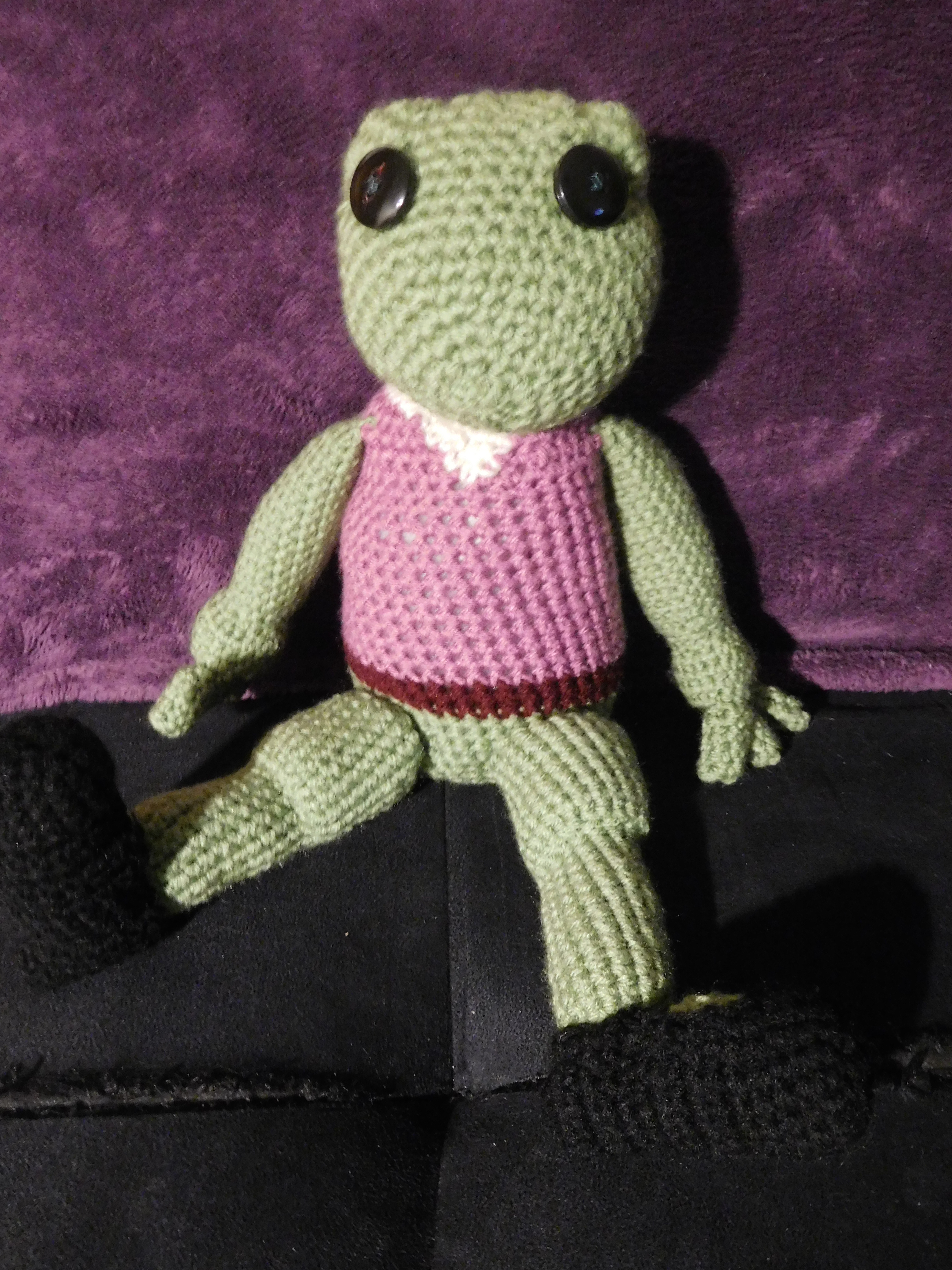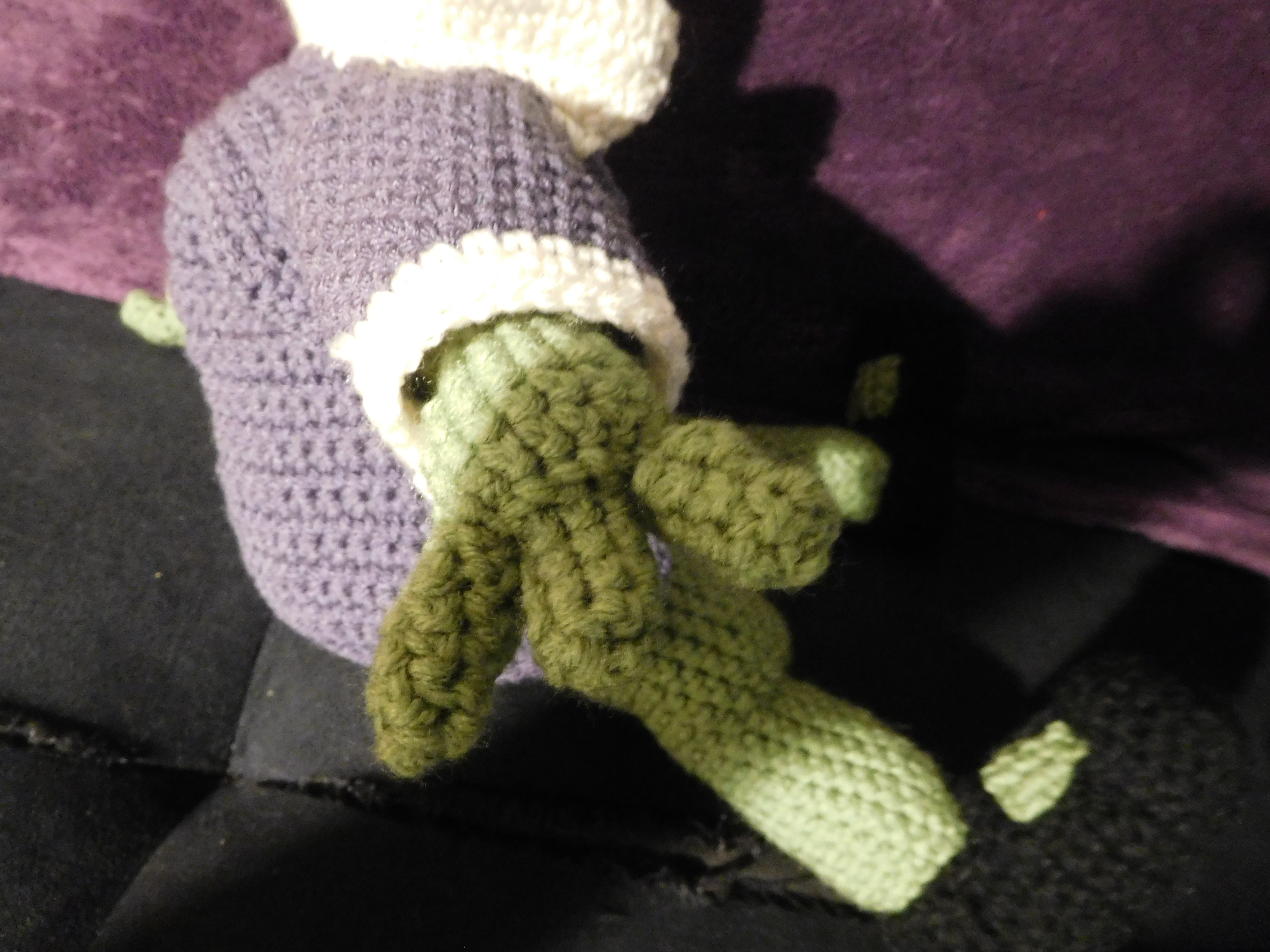 I spent the entire time thinking about how it was coming out all wrong. First, the head was wrong because I couldn’t get the eyes to be bulbous enough. Then, the torso was wrong because the neck was too thin and the collar didn’t have enough poof. Then, the legs were wrong because what was meant to be a bend came out as a chunky thigh. In short, I had no idea how to replicate this frog, and could find no similar patterns anywhere. Overall, my stalling due to perceived failure made the project take months longer than it should have, especially with all the pulling out and re-crocheting I needed to do.