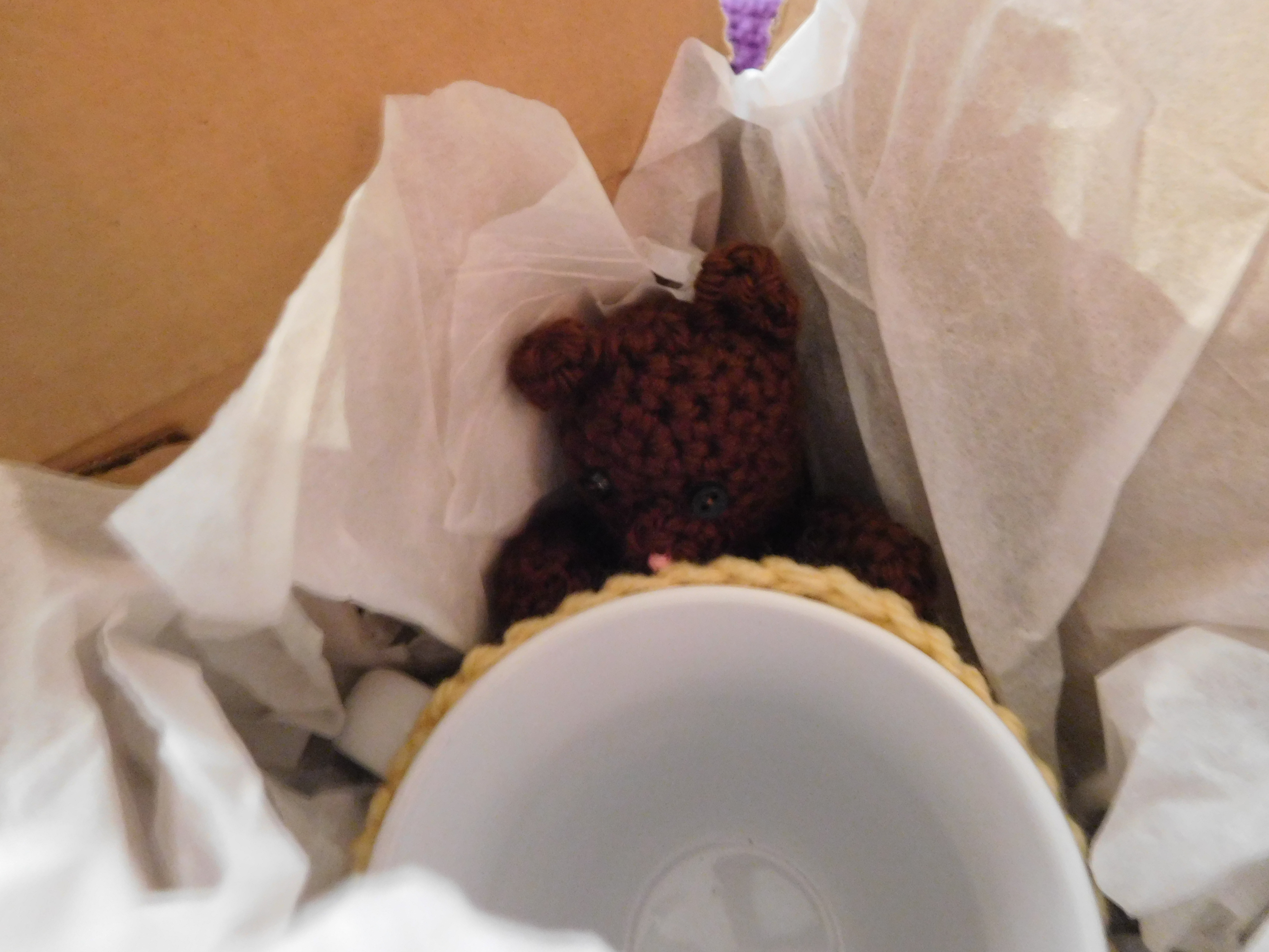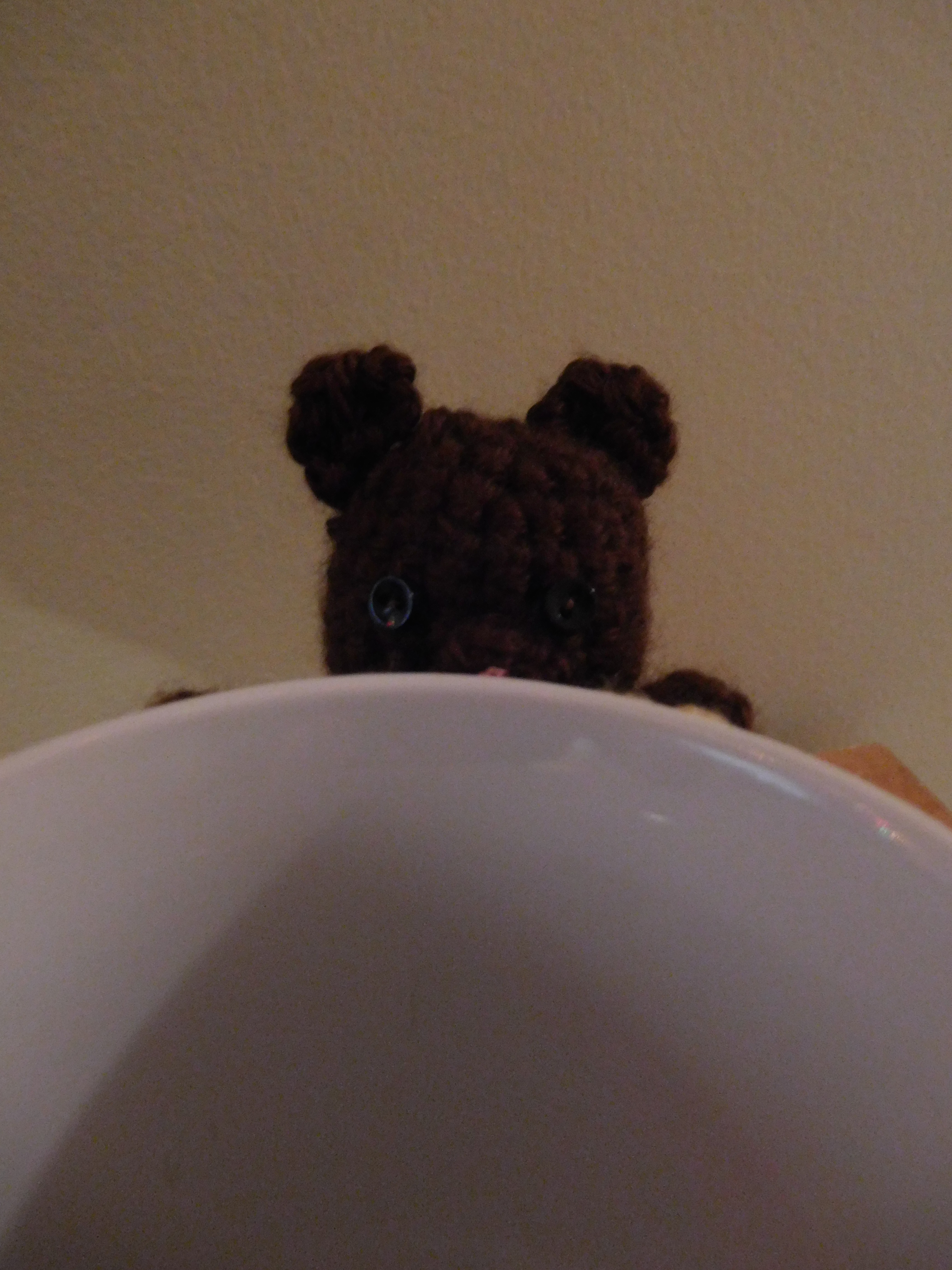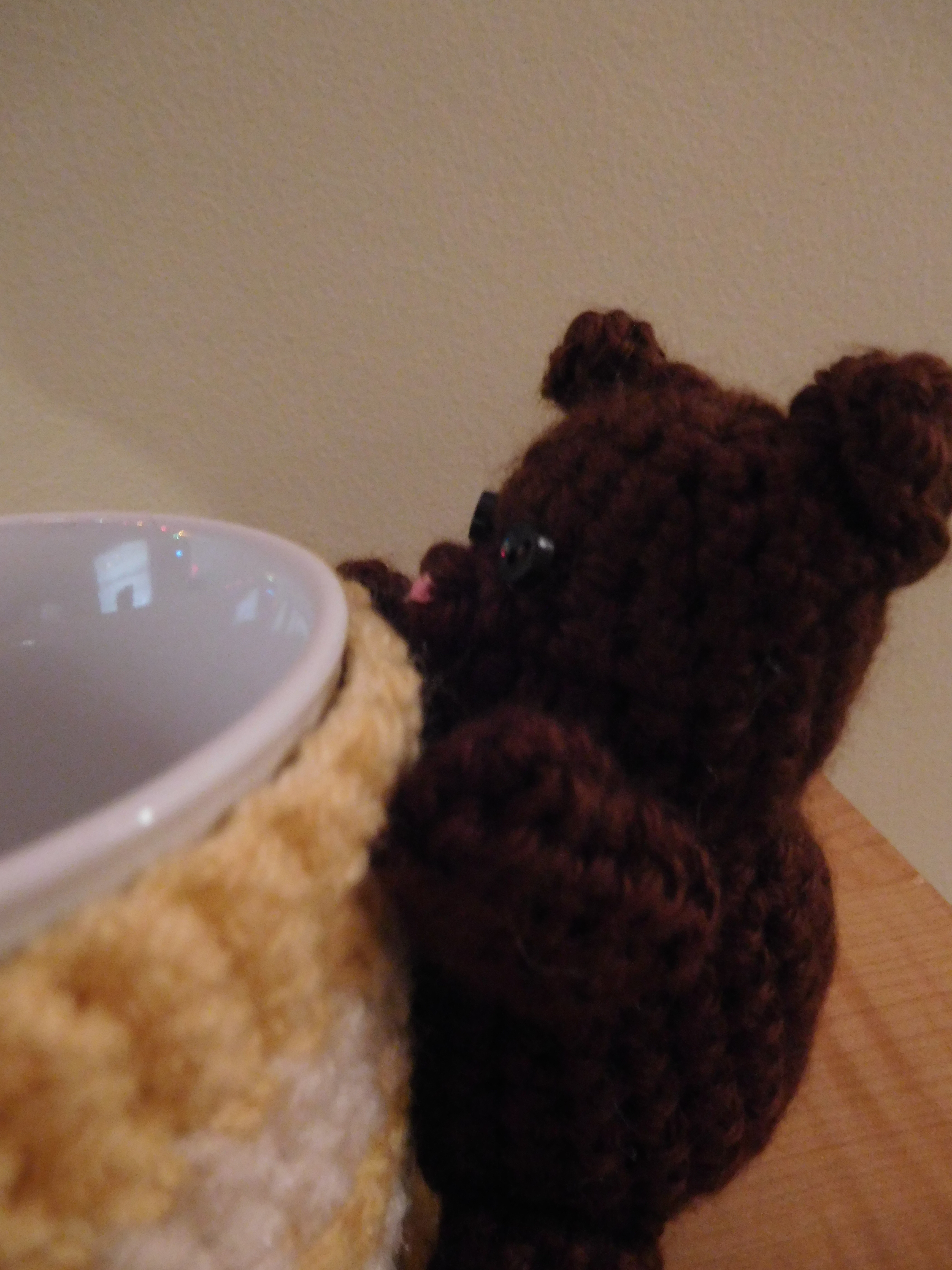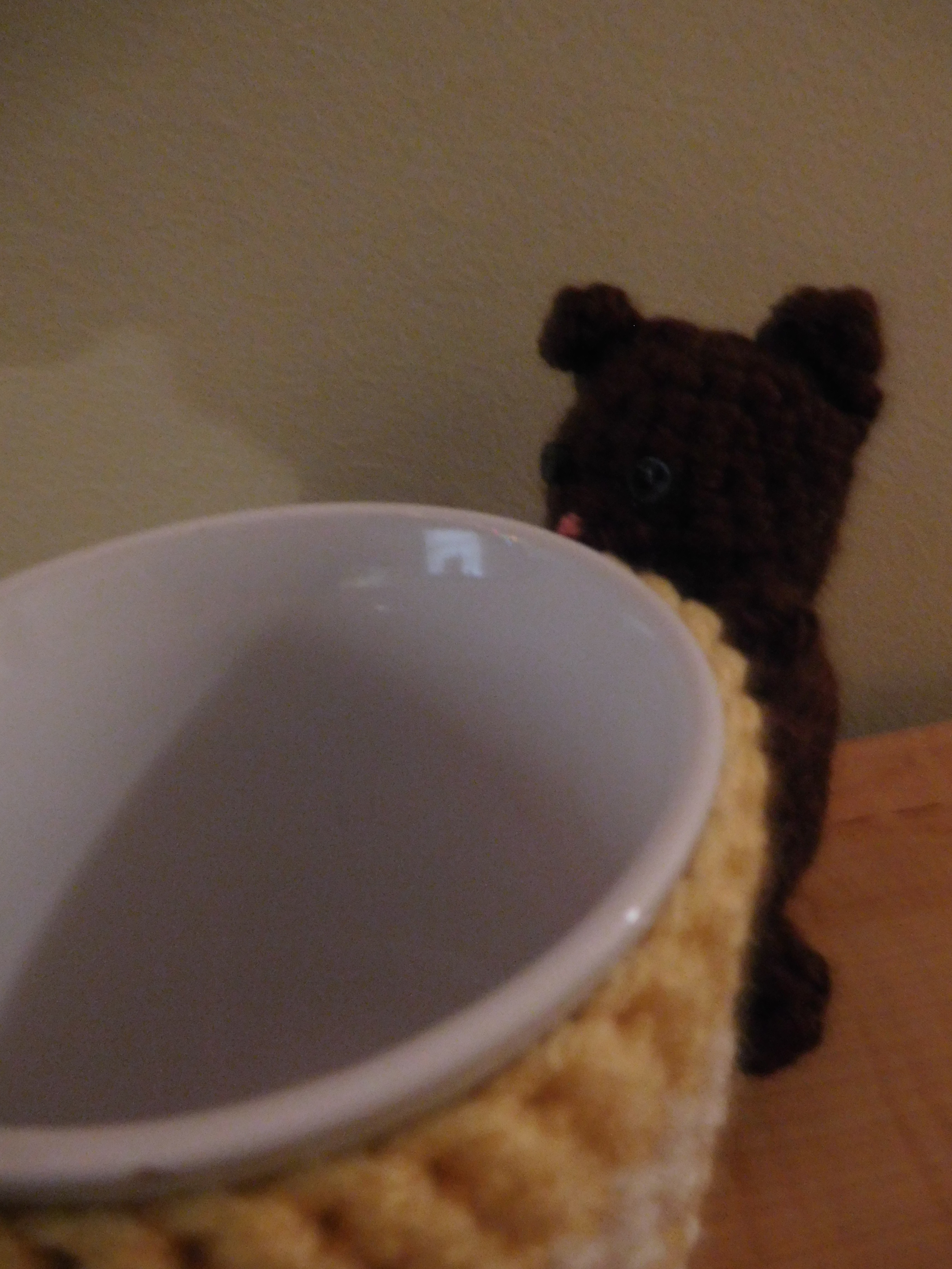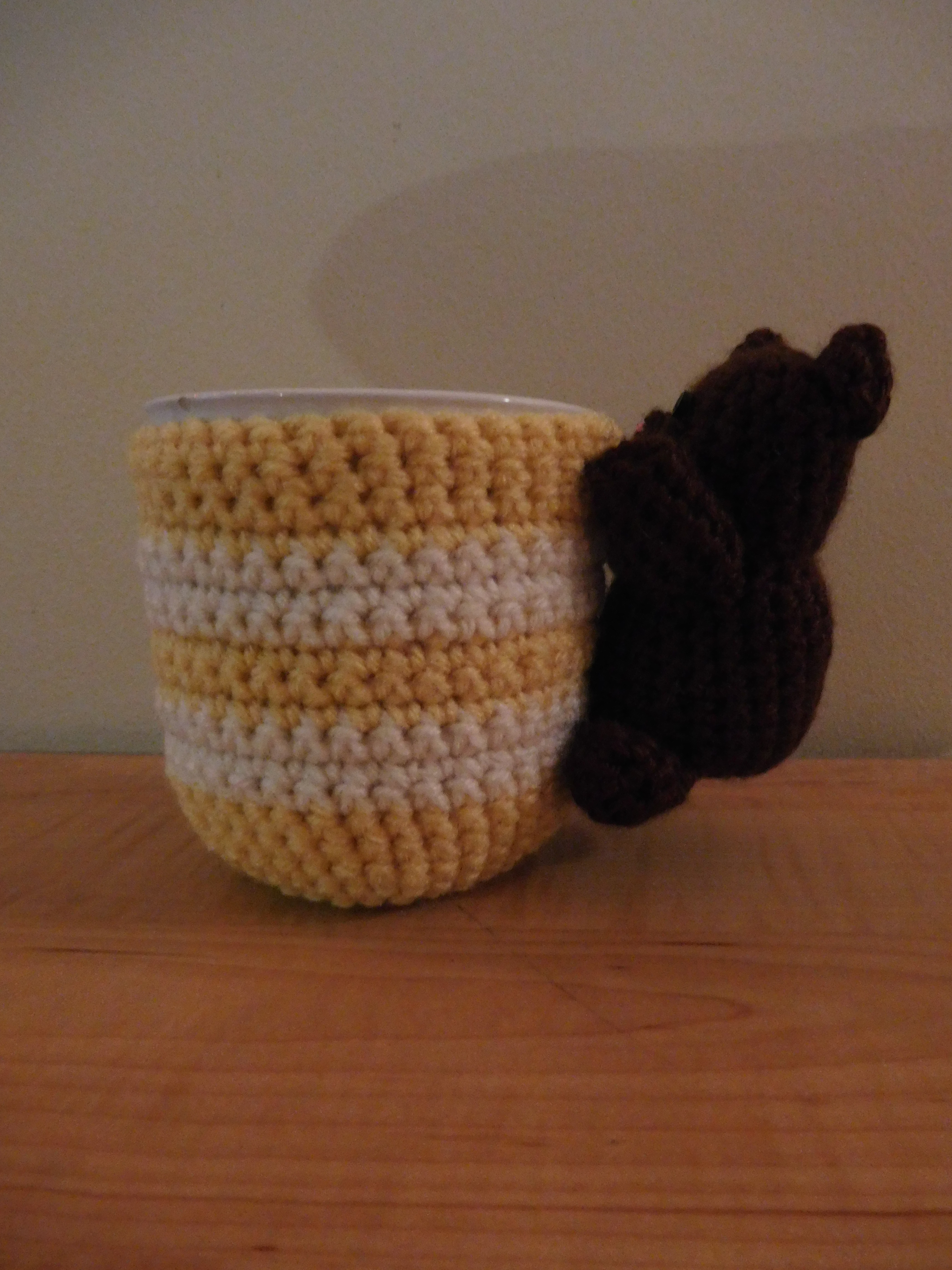 Unfortunately, it’s pretty dark in color so it’s hard to see what it is in the picture, but it’s a little bear clinging to the side of the mug. I wanted him to look like he’s peeking over the edge, about to climb in and steal her drink. The coozy itself is supposed to look like honeycomb. So, it’s technically an upside-down beehive, but she wouldn’t be able to drink from it if the bear was facing the right way.