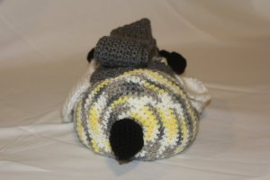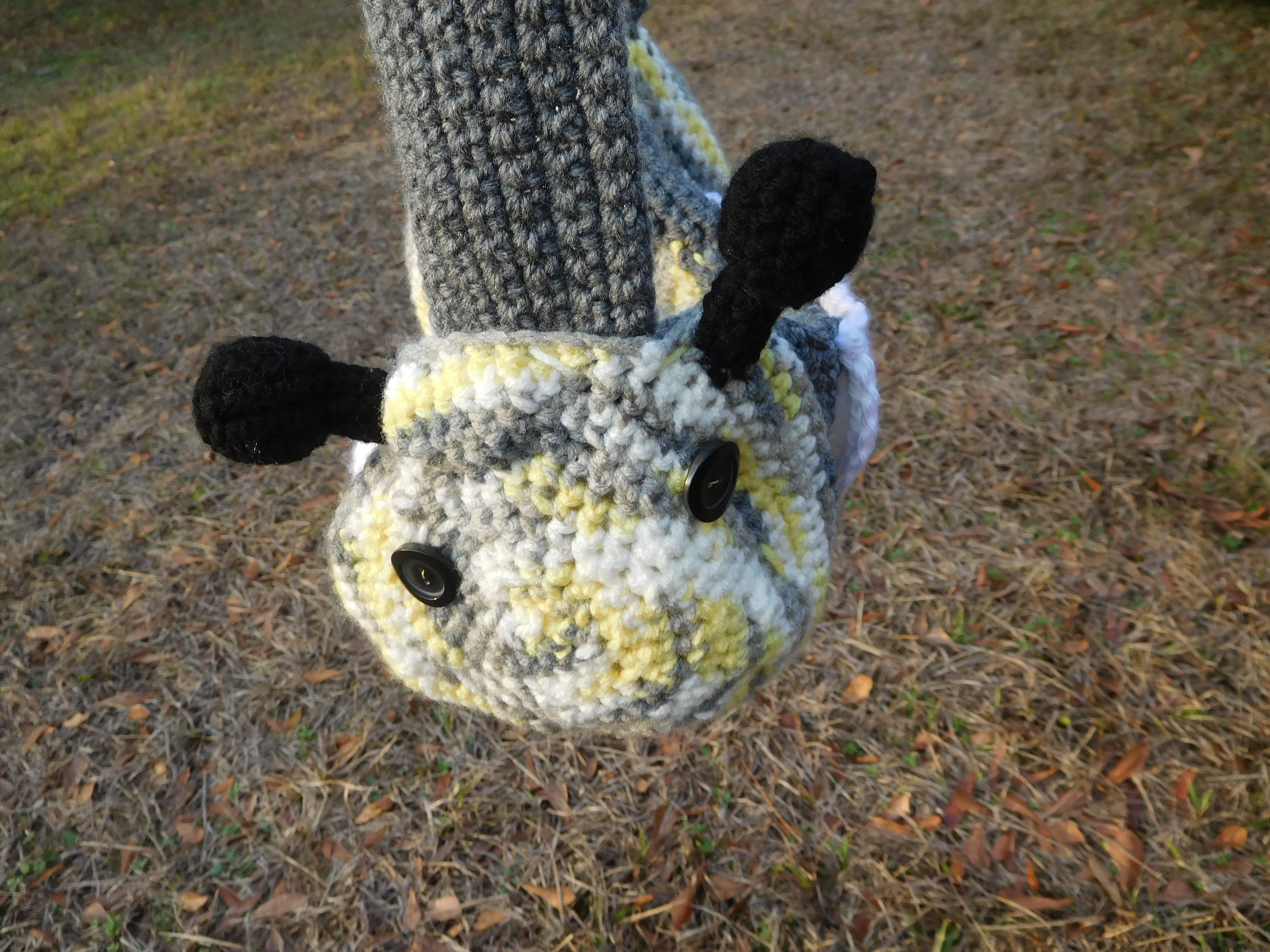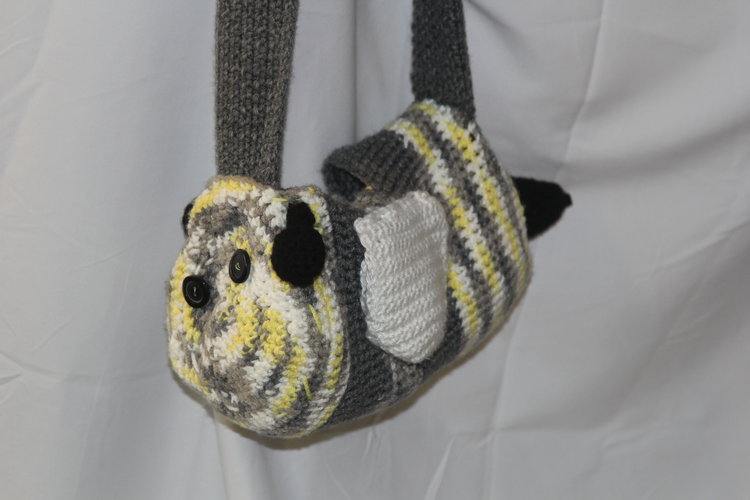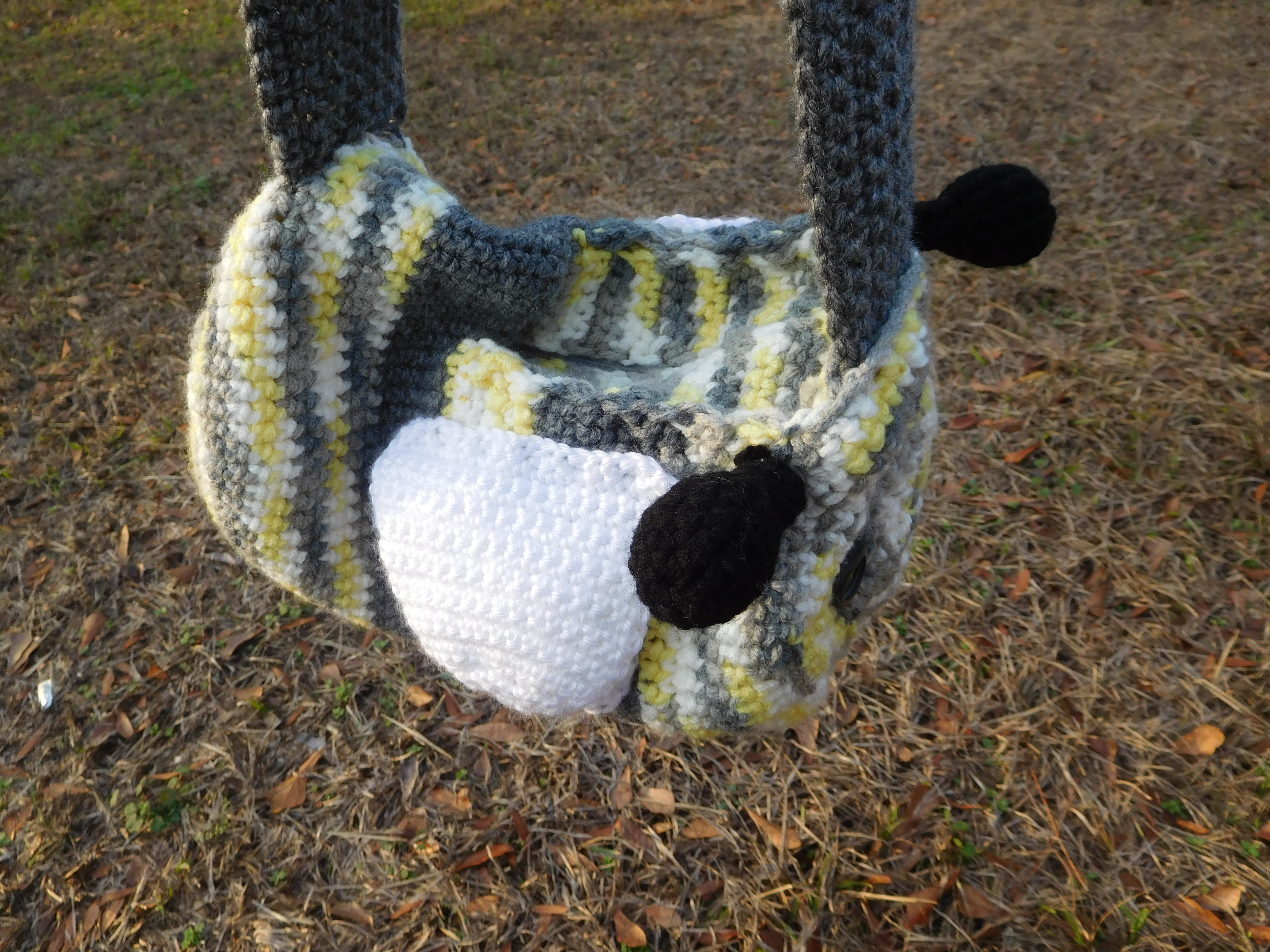 So not too long ago, I decided it was about time for a new bag. I was going to make one similar to my last one, which was generically bag-shaped, but then, while looking for what color I wanted, I found this adorable grey-yellow striped yarn and thought, “Why don’t I make a barrel bag that looks like a bumble bee? And thus, Bee Bag was born!