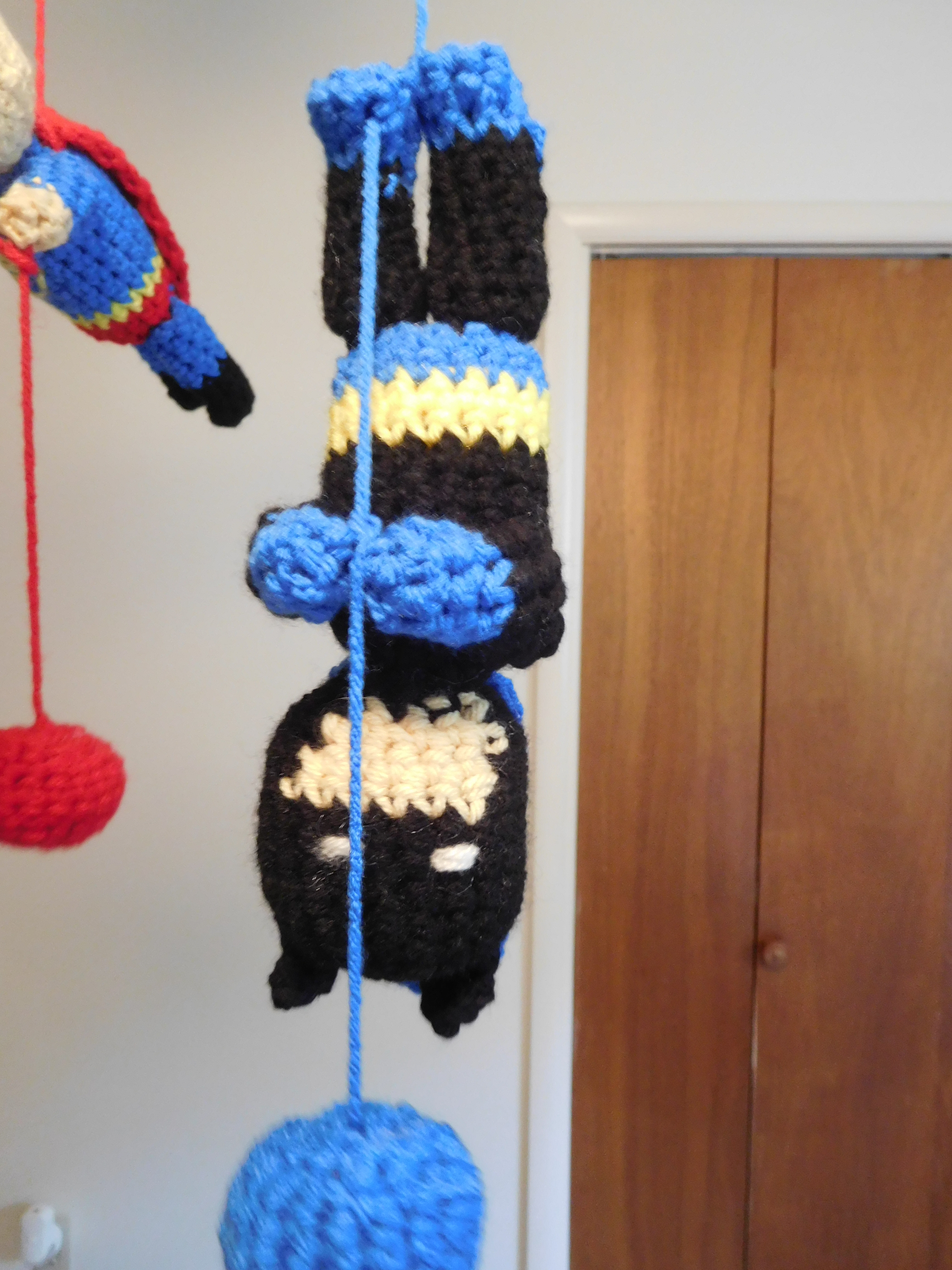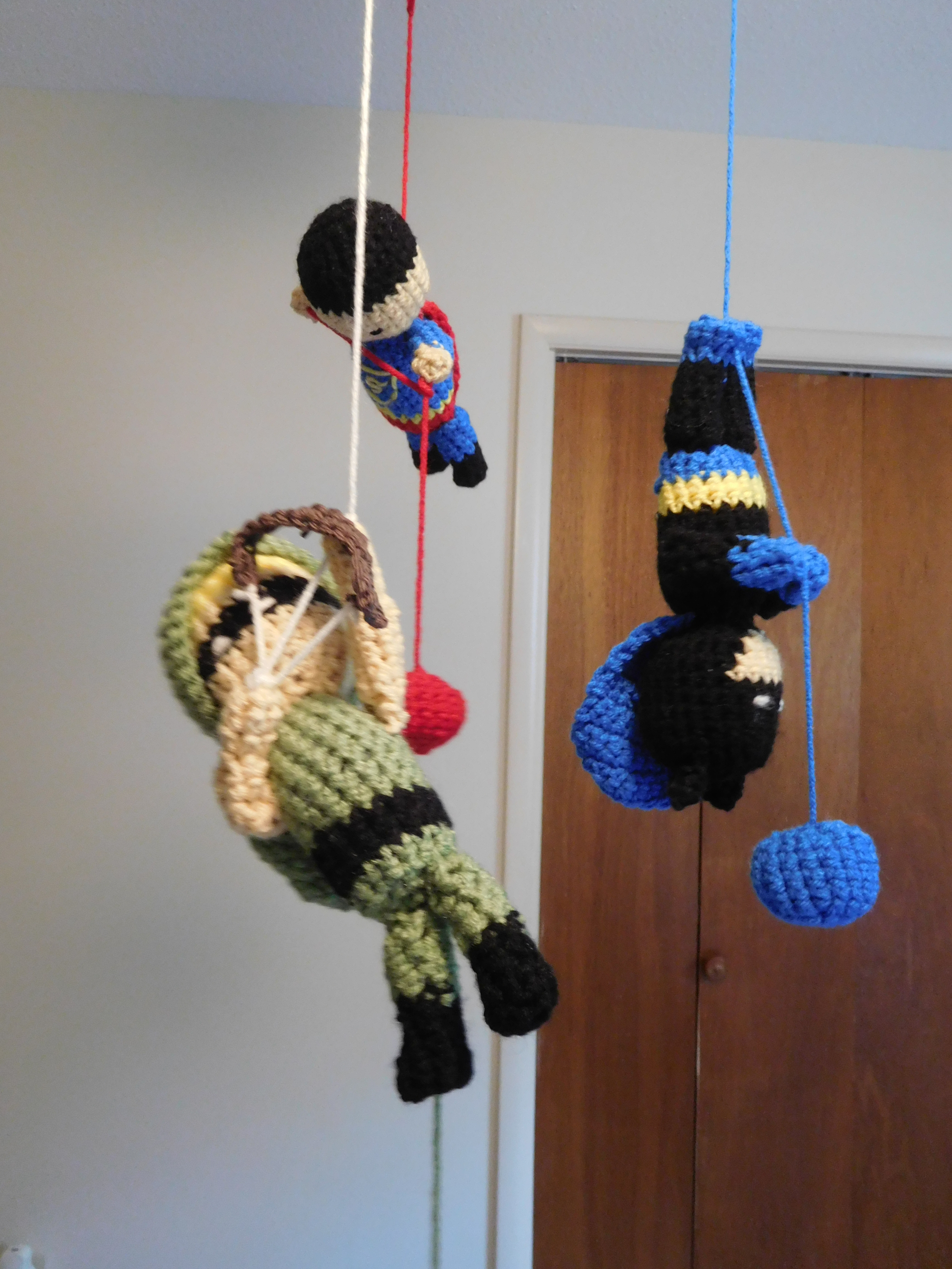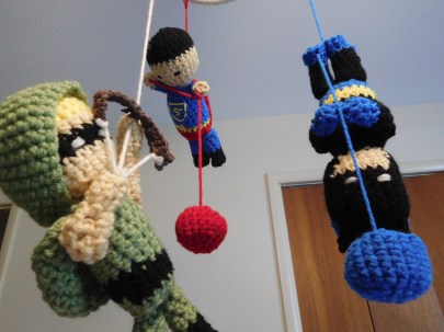 And I wanted to be sure that they were all attached to the mobile in different ways. Green Arrow with his bow, Batman sliding upside-down, and Superman flying.