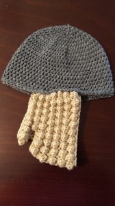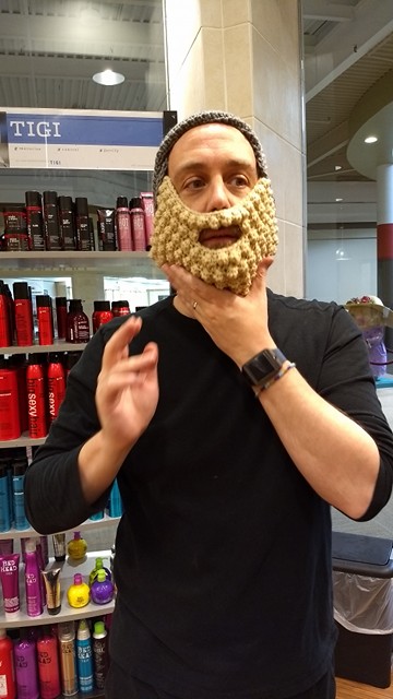 This hat has a built-in beard. I made it for my hairdresser, who had mentioned it when he found out I crocheted. He was thrilled! Happy enough with it to let me take pictures!