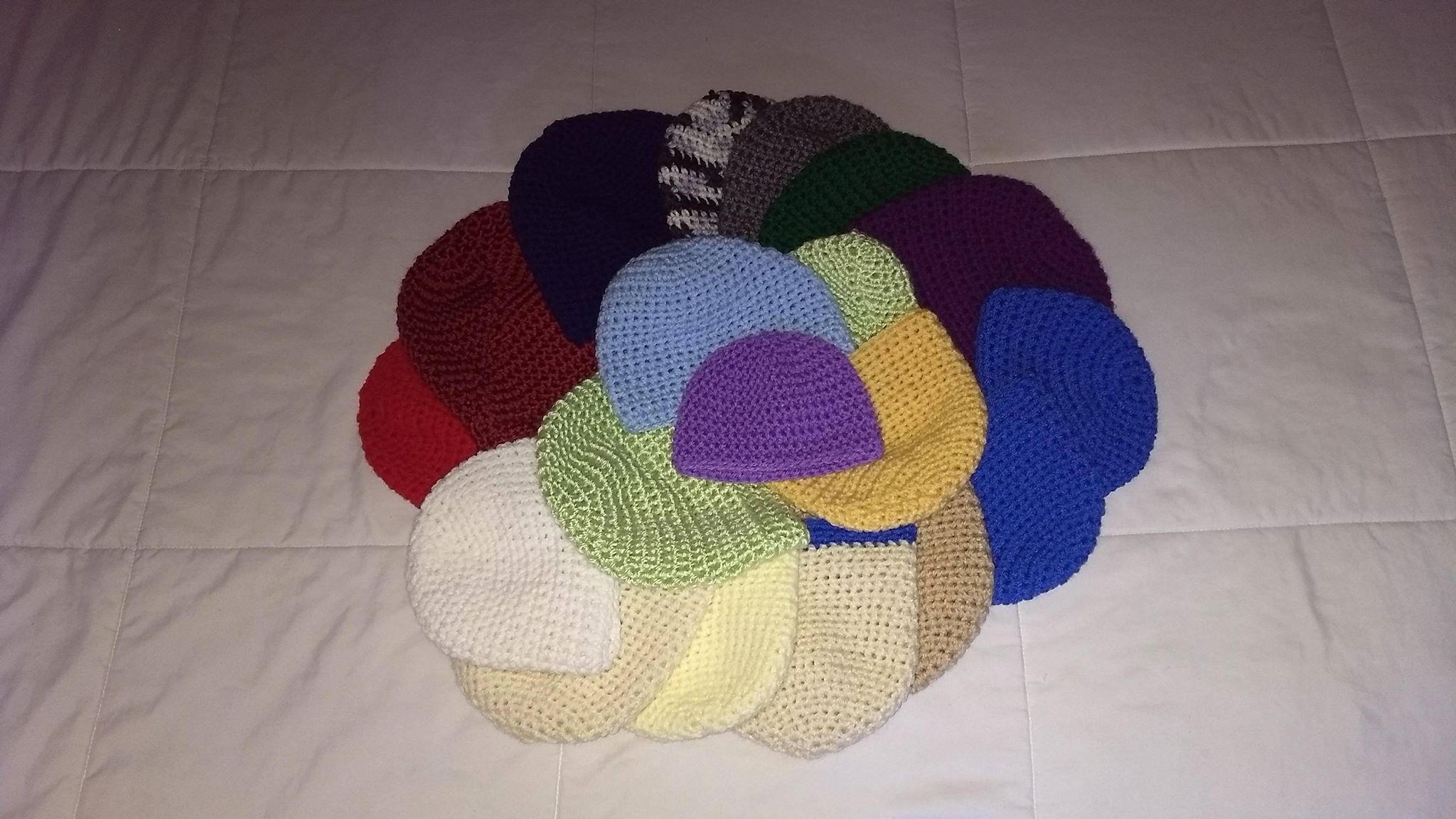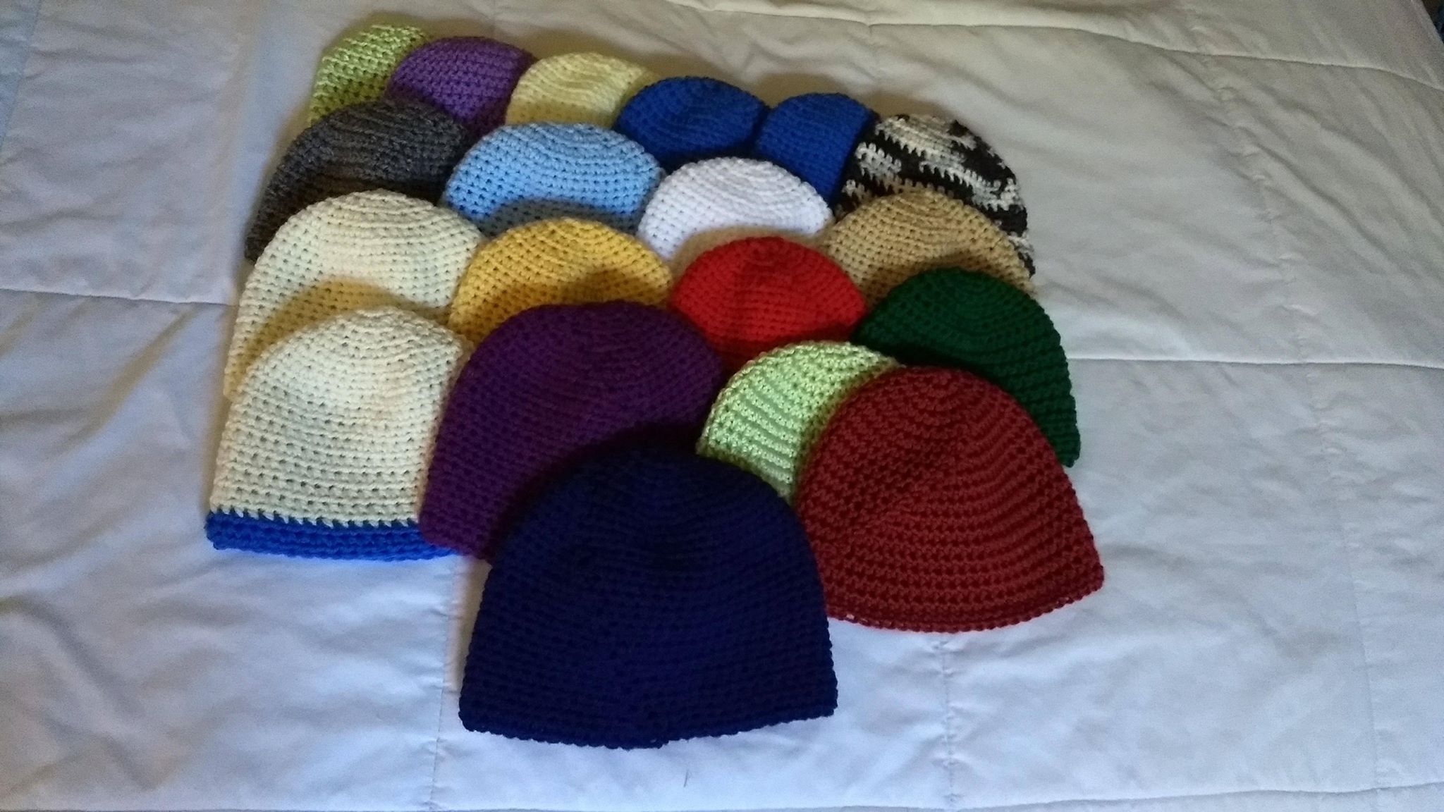 While we’re on the subject of hats, I also crocheted nineteen mini hats for a friend of mine going on a trip to Rwanda to help underprivileged children. So here’s those, too: