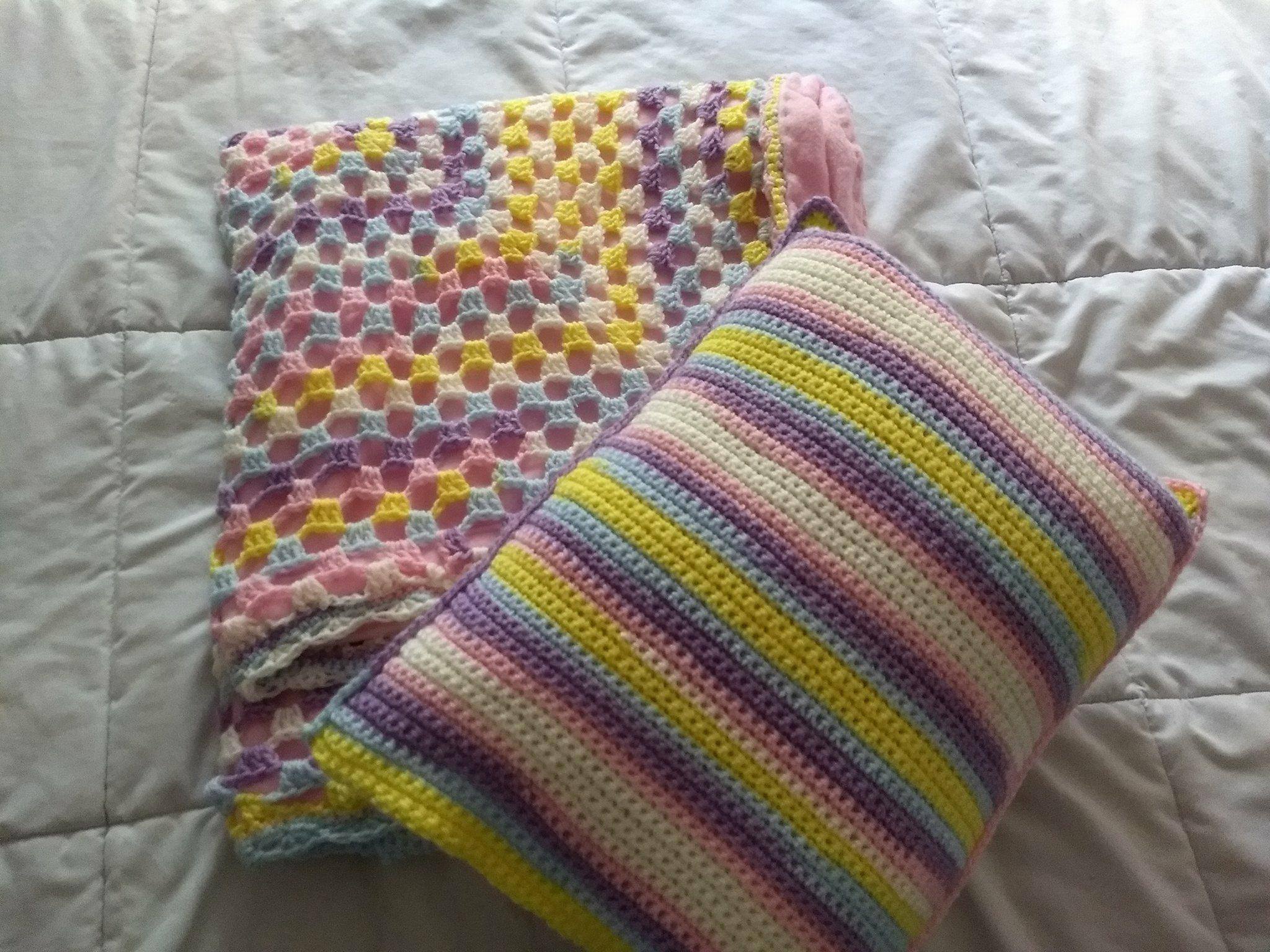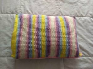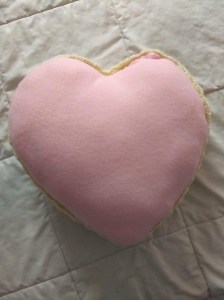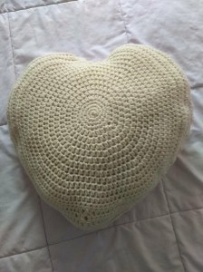 This was my first time making a heart-shaped pillow, and also my first time using felt to finish a project. I tried using a sewing machine for the blanket (which has felt on the backside so the blanket will be warm despite the holey-ness), to attach the felt, but it was a fiasco. I have to say, sewing isn’t at all my strong suit. That being said, half of the blanket and the entire pillow were sewn by hand.