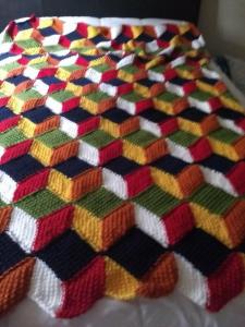It’s meant to look like a 3D Rubik’s Cube, and I think I did the job well! It’s a queen size – my biggest blanket yet – so I have plenty of pictures of it. Including works-in-progress: