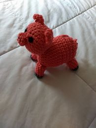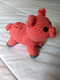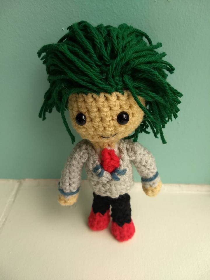 The felt eyes are also new for me. Up until now, my eyes have either been buttons or crocheted, so I was pretty nervous about the idea of cutting them out. (Drawing is not my strong suit.) But it actually worked fairly well! Here’s a picture of him in the shop where I sent him off. The lighting’s not great, but I think it shows how well he stands up on his own.